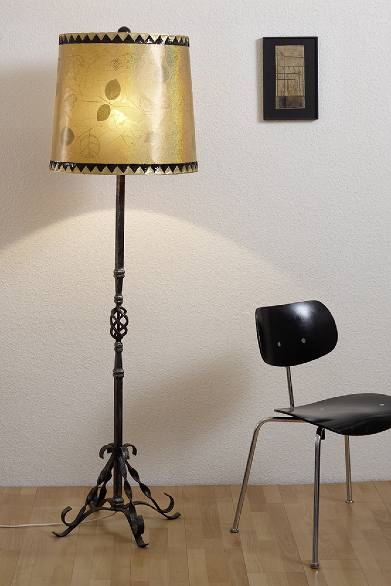 Material: Stoff, Lampenschirm, Bordüre, Fasermalfarbe, Papier, schmiedeeiserner Ständer