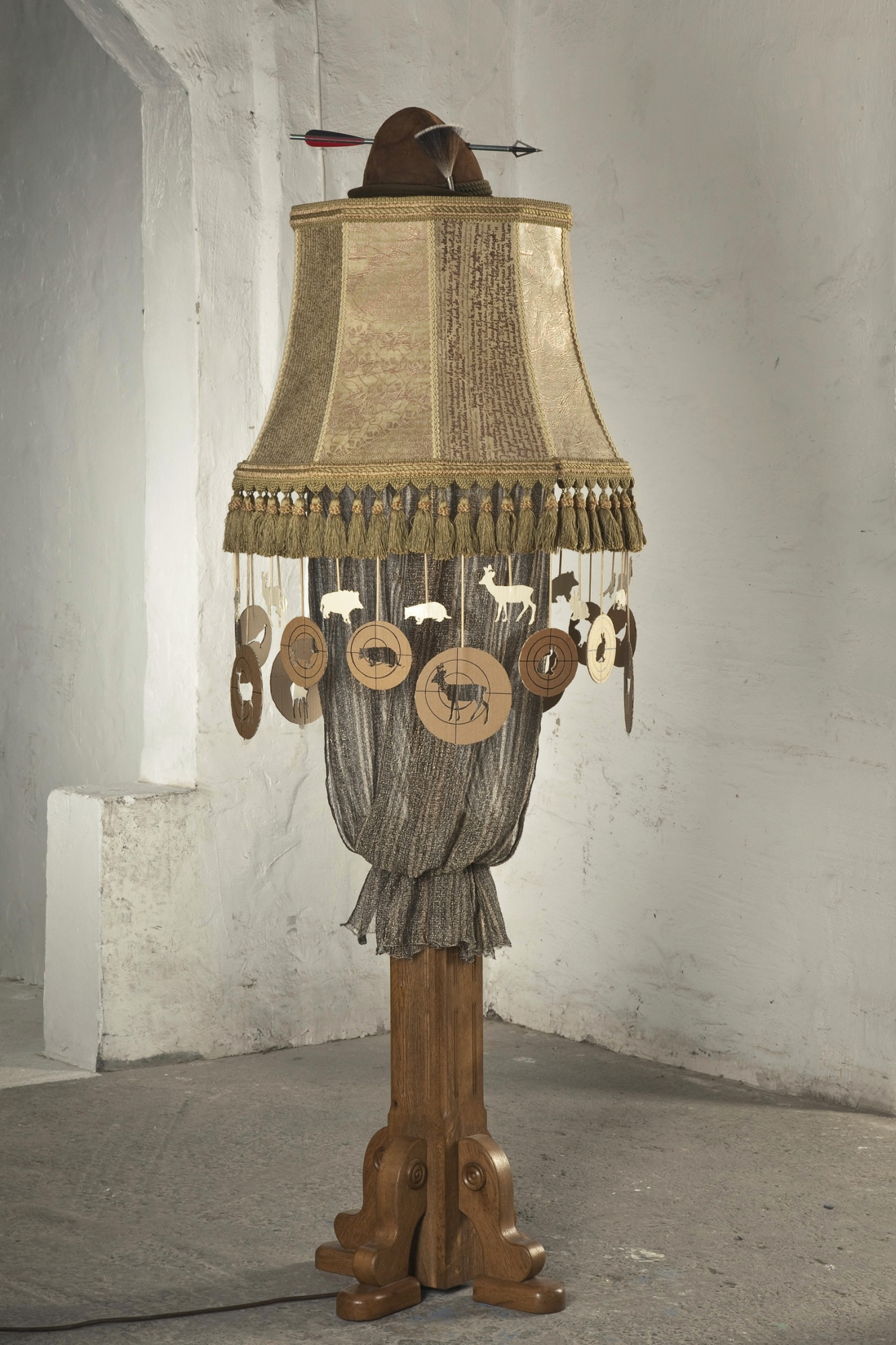 Pro und Contra zum Thema "Jagd", eine kritische Auseinandersetzung: von Lust bis Frust, von Zeter und Mordio, von Kultur versus Natur. Der Schirm ist außen und innen reich bebildert und beschriftet, und zwar so, dass in ausgeschaltetem Zustand die Freude am Jagen sichtbar wird, eingeschaltet jedoch die bittere Schattenseite des Contra von innen durch das Pro hindurchleuchtet. Diese ehrwürdige Leuchte hat etwas Unwirkliches an sich: Unter den dicken pompösen Troddeln schweben karussellgleich die Geister der getöteten Tiere samt ihren Zielscheiben.