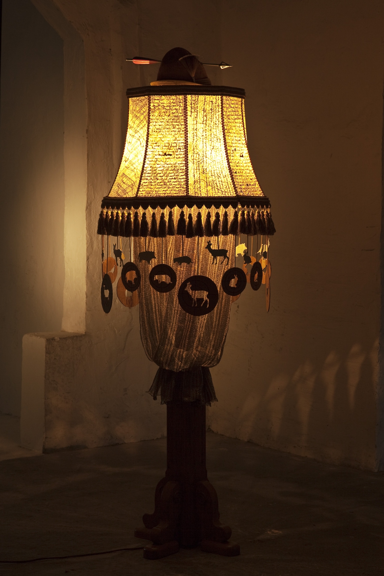 Material: Lampenschirm mit Pergament und Bordüren, Lackmalfarbe, Jagdhut, Pfeil, Holzspieße, Wellpappe, Pigmenttinte, Tuch, Holzständer
