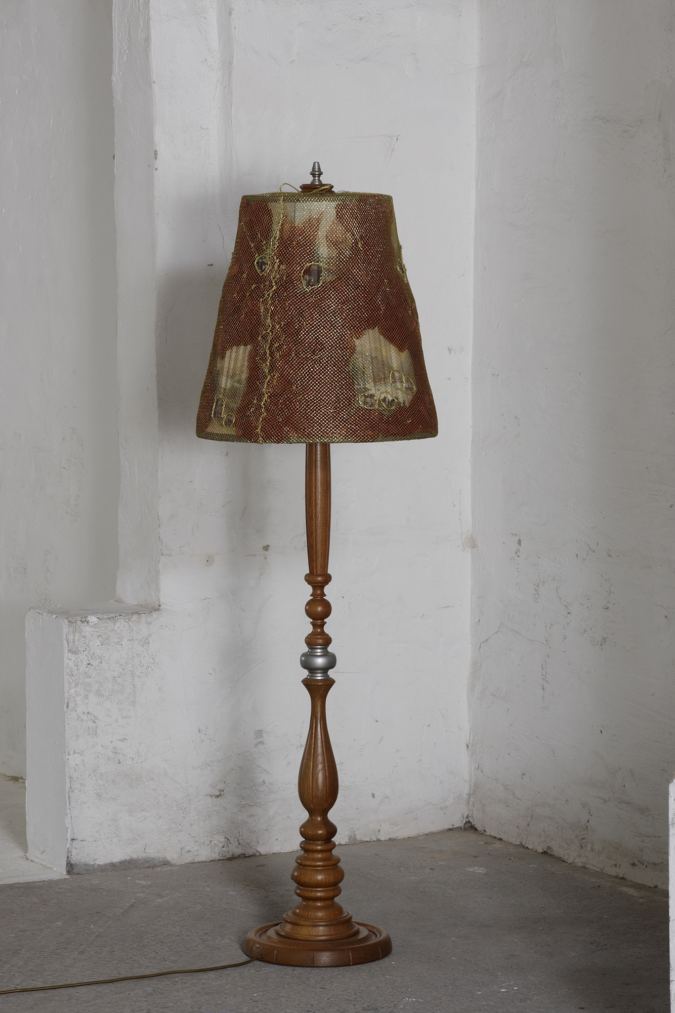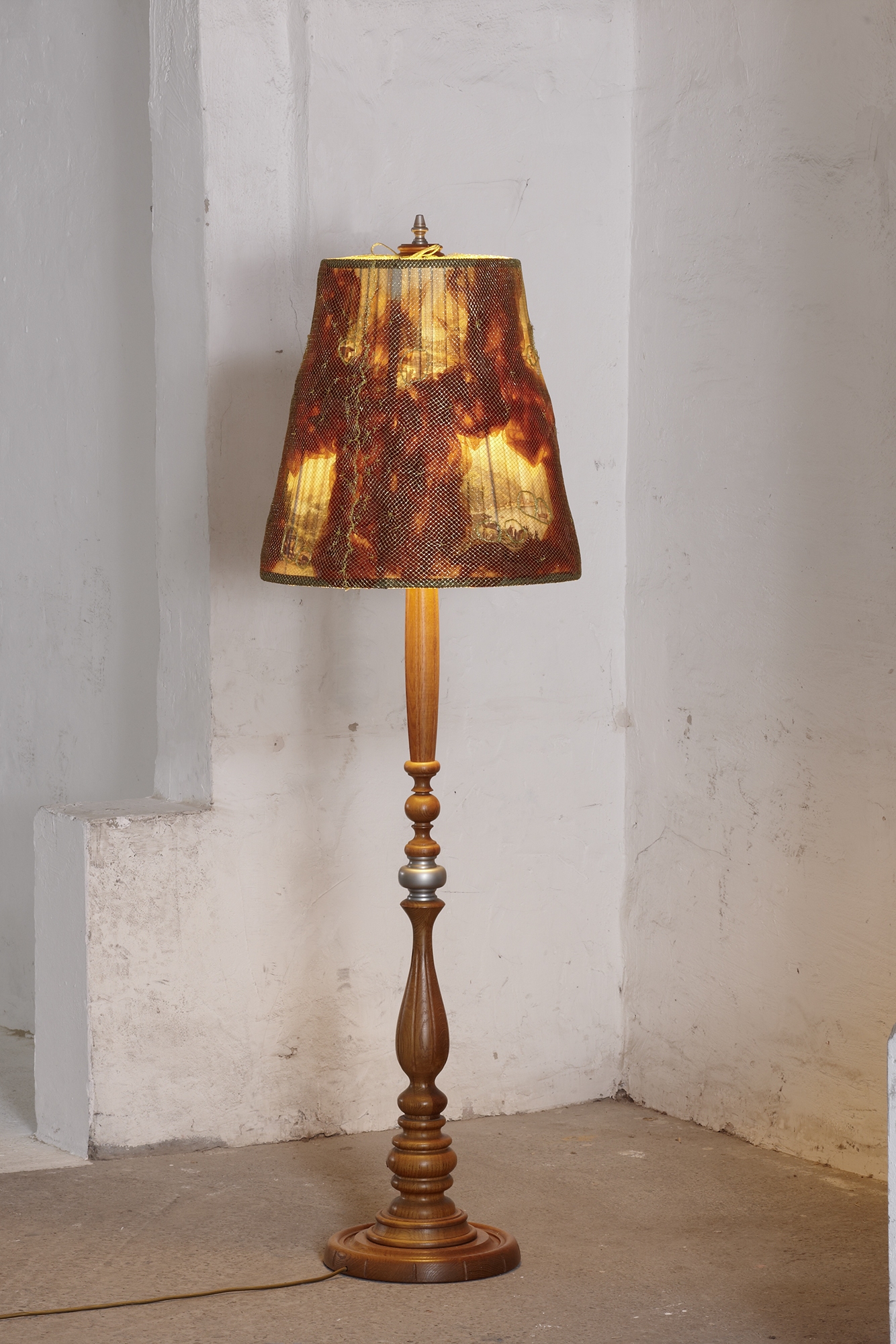 Material: Lampenschirm, Wachsmalkreide, Seidengarn, Organza, Messingständer