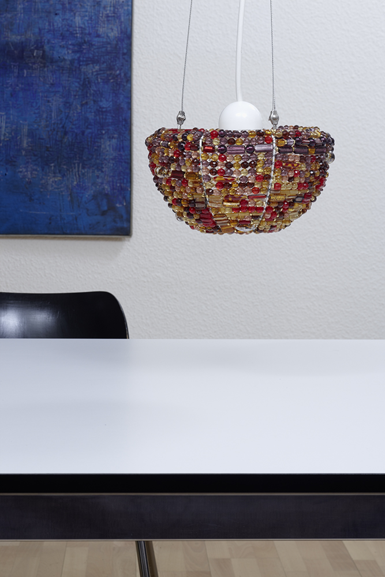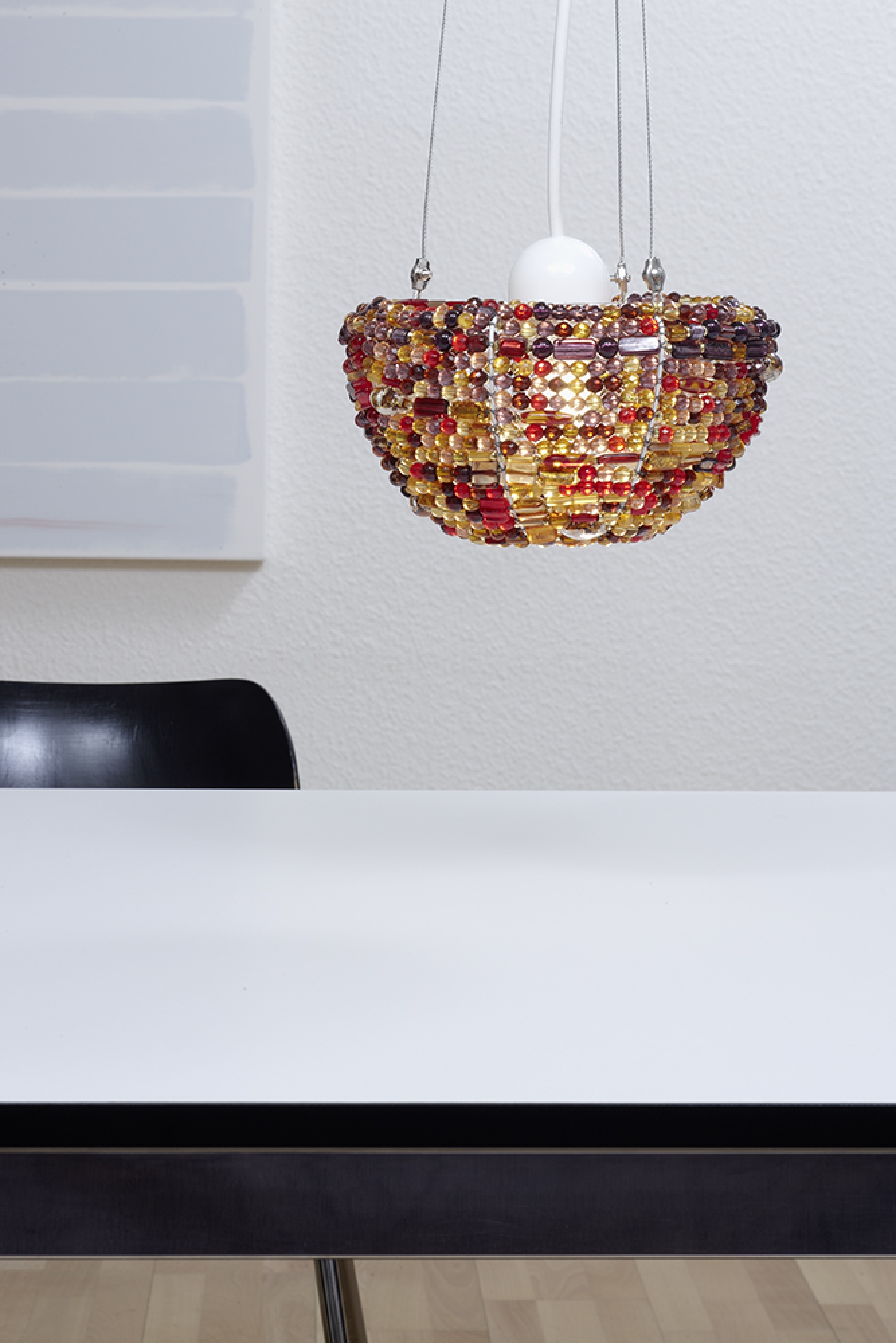 Dieser Halbmond hängt waagerecht und - im Gegensatz zu dem am Firmament - mit dem Bauch nach unten. Auch farblich braucht die Pendelleuchte den Vergleich nicht zu scheuen. Die satten Goldtöne variieren paradoxerweise von rot bis violett. Manche der handgefertigten Perlen weisen Einschlüsse auf - wie bei Bernstein.